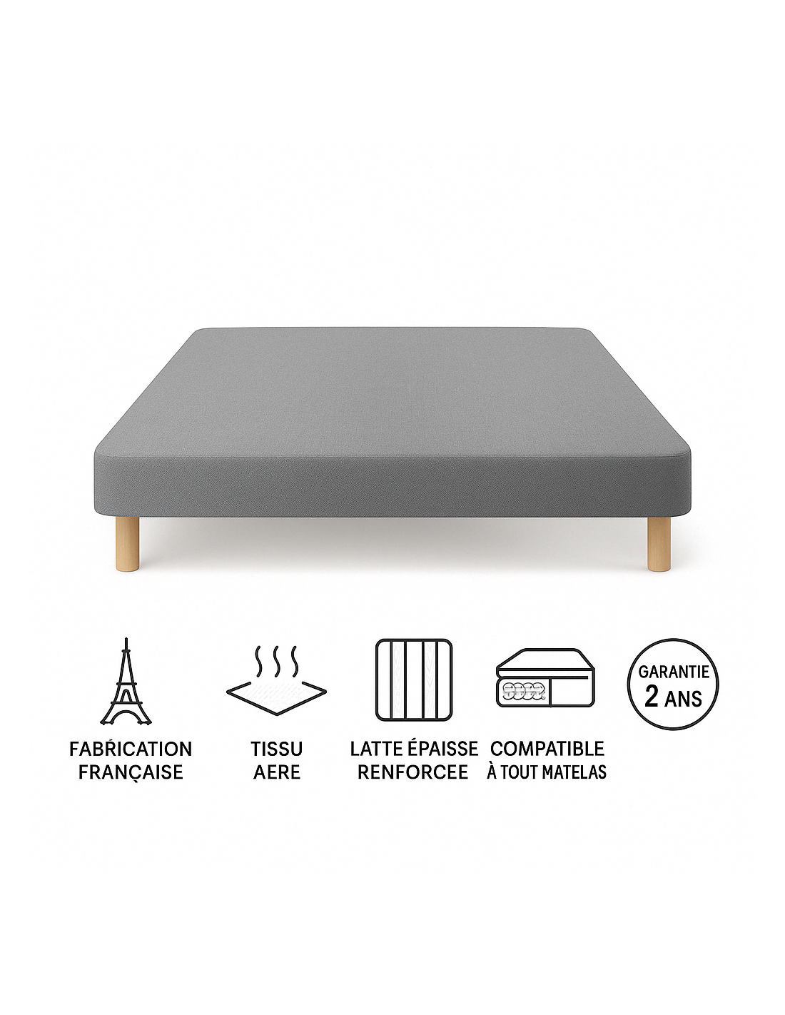- Fabrication Française : Sommier de haute qualité, garanti 2 ans.